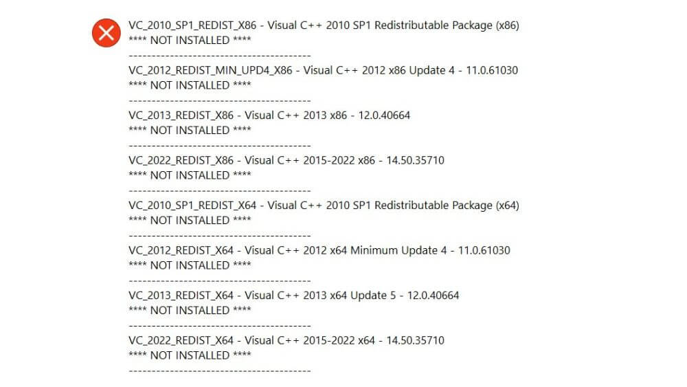 Visual C++ Redistributable ne sont pas installés.